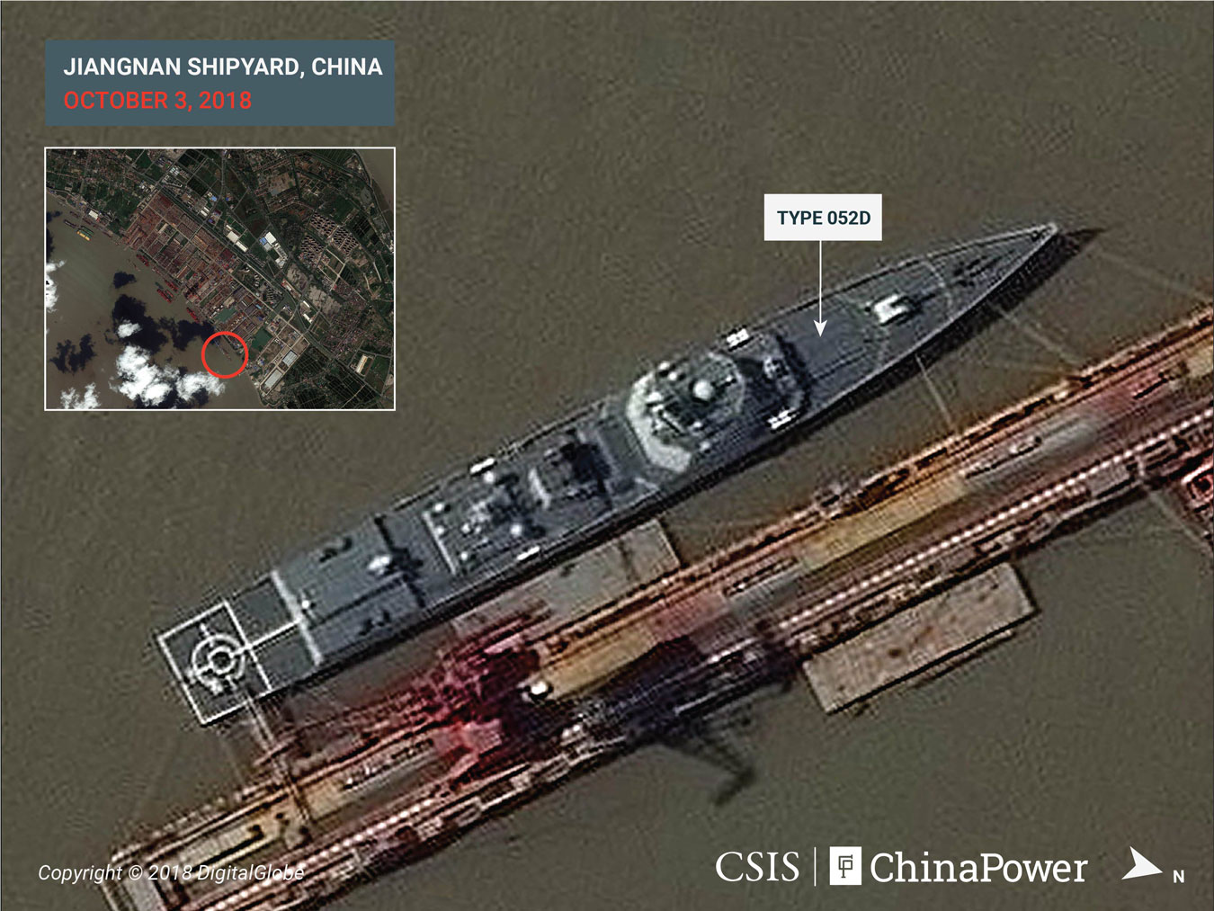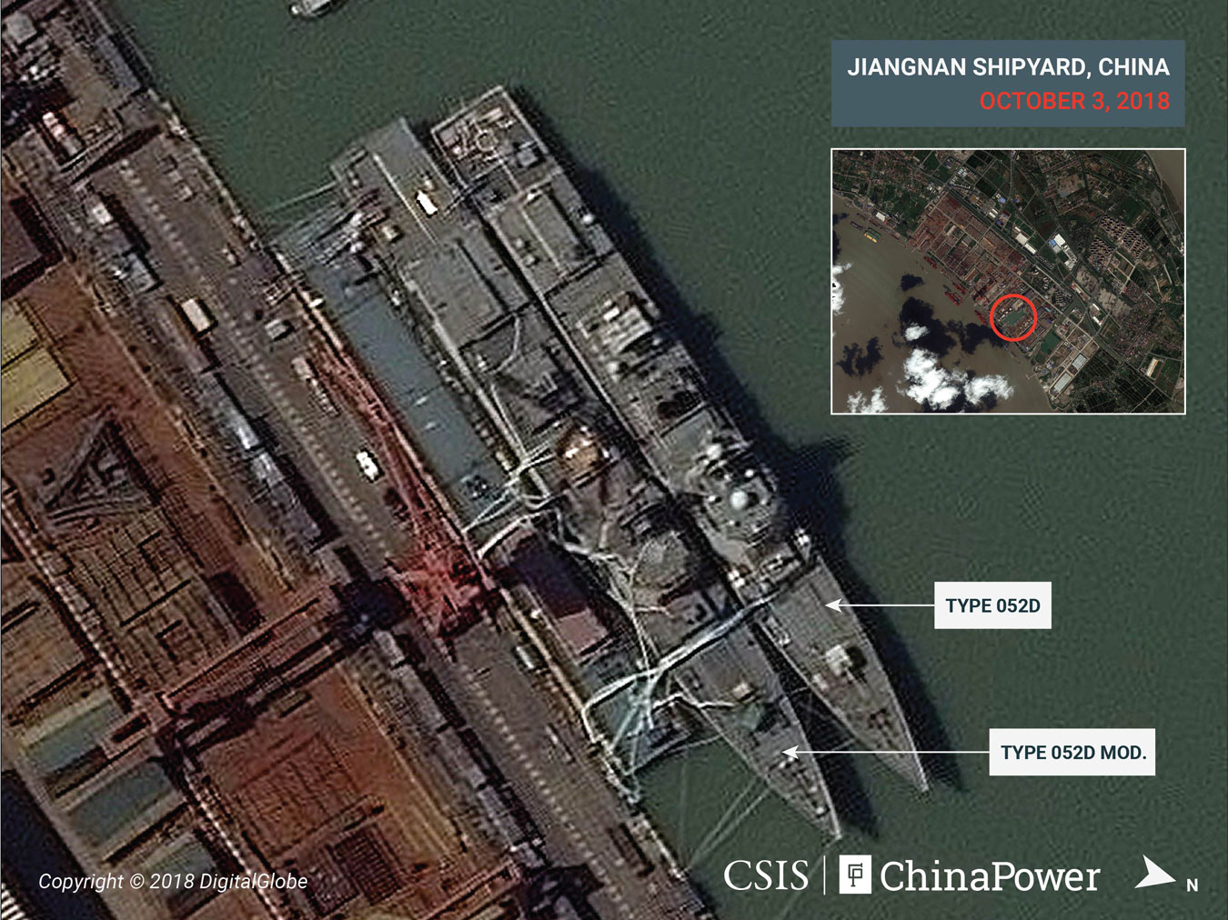 整個2018年,江南造船廠進行了大量的建設,改造和維修活動,大多圍繞著052D型、052D加強型和055型驅逐艦的建造和舾裝。14月,美國國際戰略研究中心觀察到船廠內有兩艘052D型驅逐艦,到10月後增加到5艘。其中兩艘還加長了艦尾的飛行甲板。雖然4月份時觀察到了3艘055型巡洋艦,但在4-10月蒐集的大多數圖像中,只出現了兩艘艦船的身影。第一艘055型巡洋艦於2017年6月下水,另有三艘於2018年下水。這些巡洋艦均由江南和大連造船廠建造。