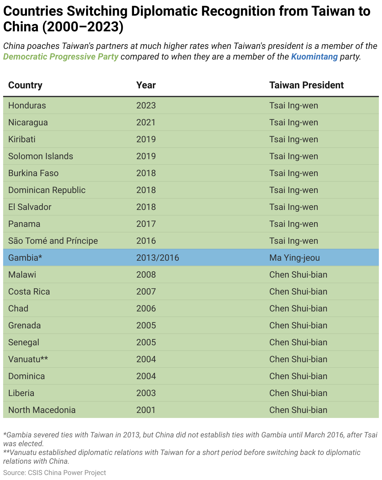 In March and April 2023, Taiwan President Tsai Ing-wen transited through the United States, during which she met with Speaker of the House Kevin McCarthy. This meeting was framed as an alternative to an immediate visit to Taiwan by Speaker McCarthy, and there were hopes that Beijing would not escalate as much as it did in August 2022 when Beijing provoked the Fourth Taiwan Strait Crisis after then-Speaker Nancy Pelosi’s visit to Taiwan.