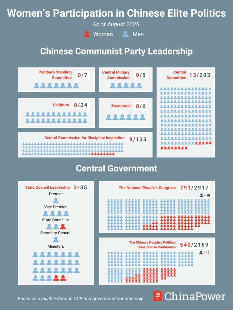 China’s lack of representation of women in politics is highly apparent in top political decision-making bodies like the twenty-four-member Politburo of the CCP. Since 1949, China has only had six female Politburo members. The Politburo of the 20th Central Committee of the CCP (2022-2027) departed from the two-decade norm of having at least one female Politburo member and has none. No woman has ever sat on the CCP’s Politburo Standing Committee, China’s most elite political decision-making body, nor has any woman sat on the Central Military Commission, which commands China’s armed forces. As of August 2025, only 13 of the total 203 members of the CCP Central Committee were women.