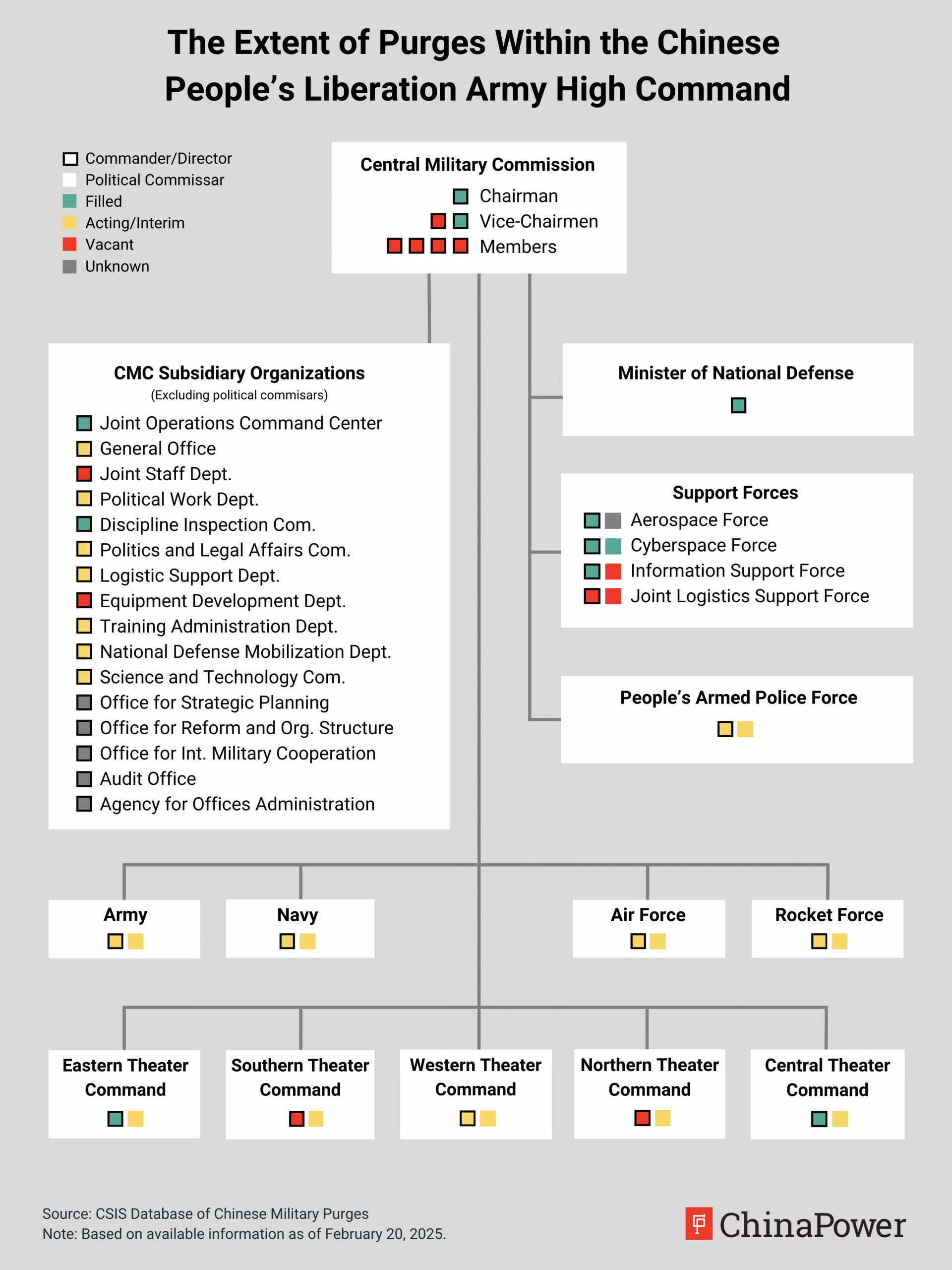 These purges have touched virtually every part of the PLA, spanning the CMC, key functional departments under the CMC, the PLA’s four services and four support forces, the five theater commands, military academies, and the People’s Armed Police (PAP).