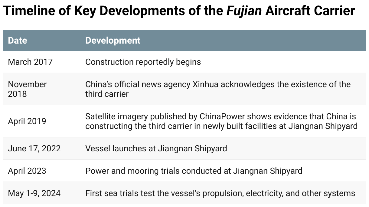 - Construction of the Fujian reportedly began at Shanghai’s Jiangnan Shipyard in March 2017, and on June 17, 2022, the carrier was launched to great fanfare. The Fujian took approximately 104 months from the start of construction to commissioning into the PLAN. In comparison, China’s Shandong carrier took 72 months.