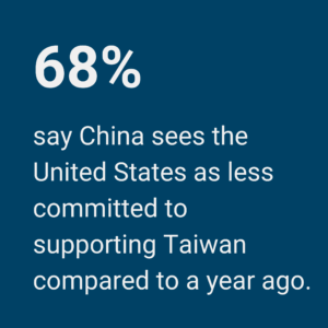 A crucial variable in deterring a Chinese attack on Taiwan is whether the United States comes to Taiwan’s defense. The survey asked participants about this issue and found that a majority of experts believe China sees the United States as less committed to Taiwan’s defense now compared to a year ago.