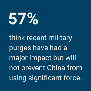 Finally, the survey sought to understand how ongoing issues within the PLA could impact Beijing’s willingness to use force in the near term. In recent years, Xi Jinping has intensified his anti-corruption and loyalty campaigns within the military, purging dozens of senior leaders within the PLA and the Chinese defense industry. The scale of this campaign could be seen at the Chinese Communist Party’s Fourth Plenum in October 2025, one of the year’s most important party gatherings. Among the 42 military-affiliated party Central Committee members, only 15 attended the Fourth Plenum. Of the 27 absentees, eight have already faced disciplinary actions and twelve have been rumored to be under investigation. Xi’s purges have even targeted members of the Central Military Commission, the pinnacle of the PLA’s leadership. Four members of the commission have been purged recently, including one of its vice chairmen, He Weidong, the top political commissar Miao Hua, and former defense ministers Li Shangfu and Wei Fenghe.