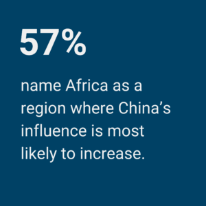 Another key area of focus for China is the Global South, where Beijing is pushing to deepen its influence. The survey asked experts to assess where in the Global South China is likely to make the most gains over the next three years (i.e., during the Trump administration). Respondents were able to select up to two regions, and Africa proved to be the most commonly picked region, with 57 percent of responses including Africa, followed by Southeast Asia, which was included in 38 percent of all responses (see figure 11).