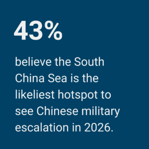 To get a high-level view of security dynamics in the region, the survey asked experts to assess where in 2026 they see the highest risk of Chinese military escalation, either intentional or accidental. About 43 percent of experts named the South China Sea as the most likely hotspot for Chinese escalation, followed by 33 percent saying the Taiwan Strait (see figure 13). This might be because China views the Philippines as less militarily capable than Taiwan, and a crisis or conflict in the South China Sea is unlikely to lead to a high-intensity kinetic war like one over Taiwan. China may also perceive that the United States is less focused on the dynamics in the South China Sea.